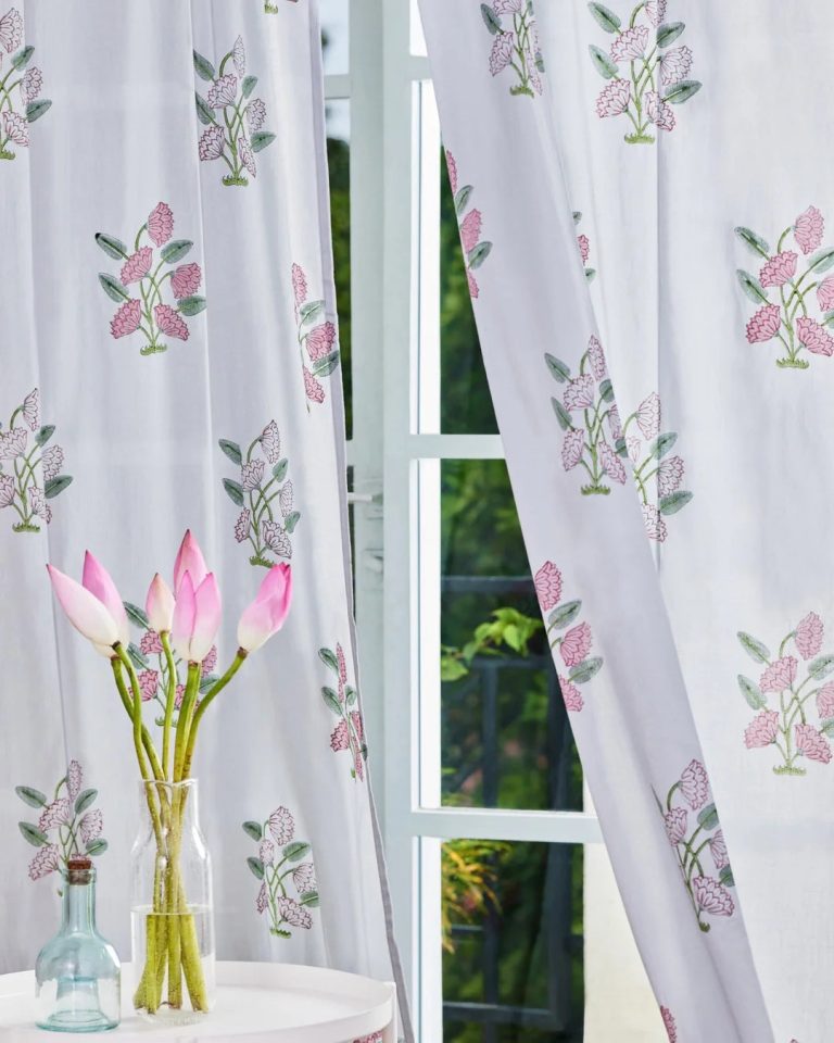 Light Grey & Pink Hand Block Printed Linen Curtains | Lotus Flower Design