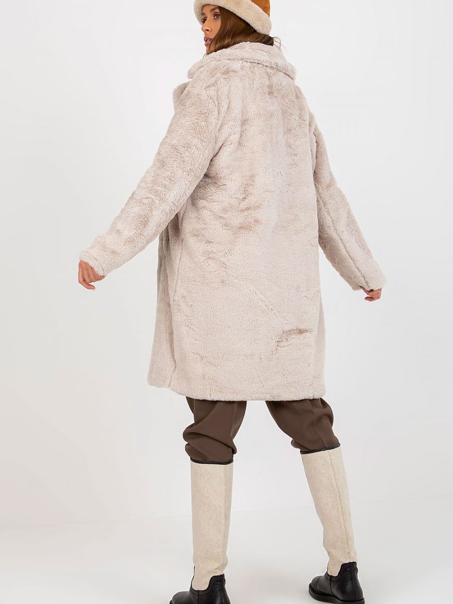 Fur coat with long sleeves, buttoned. The coat is fully lined, with slip pockets on the sides.