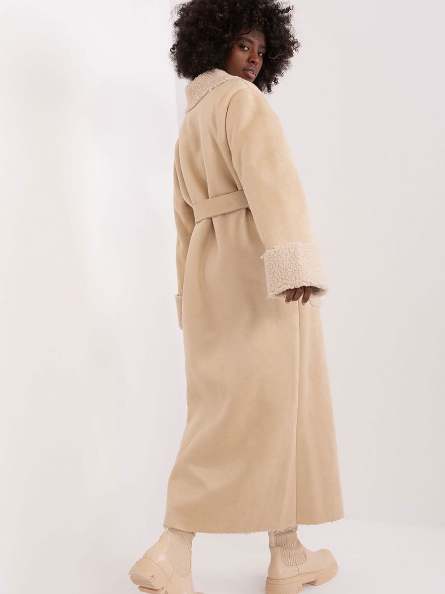 This coat is not only a practical solution for winter days, but also an expression of personal style. The coat is designed in a casual style, which makes it perfect for everyday situations, both casual and work. However, it is additionally enriched with a touch of elegance, making it a versatile choice. The material used to create the coat is characterized by a varied texture, which gives it a unique character. It is the subtle details that determine its uniqueness. This coat has insulation, which provides an excellent barrier against the cold of autumn and winter. Long sleeves and buttons protect against unpleasant weather conditions. The ankle length accentuates the silhouette while providing protection from the cold. The tie belt allows you to adjust the waist circumference, which allows you to adjust the coat to individual preferences and figure. The slip pockets not only serve a practical function, but also give the coat a casual feel. The lined lapels add to its elegance, creating a harmonious whole. This sheepskin coat is a proposal for women who appreciate both functionality and fashionable design. It will be perfect for winter days, adding style to any everyday styling.