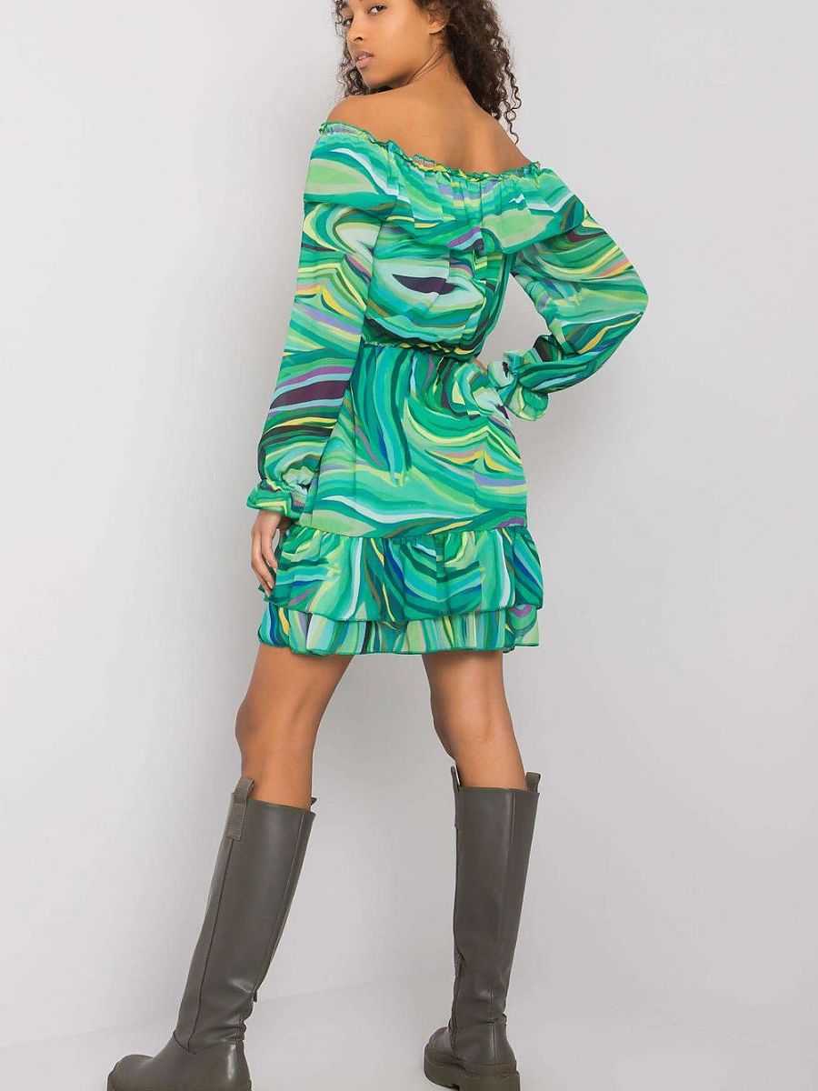 Dress with long sleeves and a Spanish type neckline. The dress has a lining, the bottom decorated with frills.
