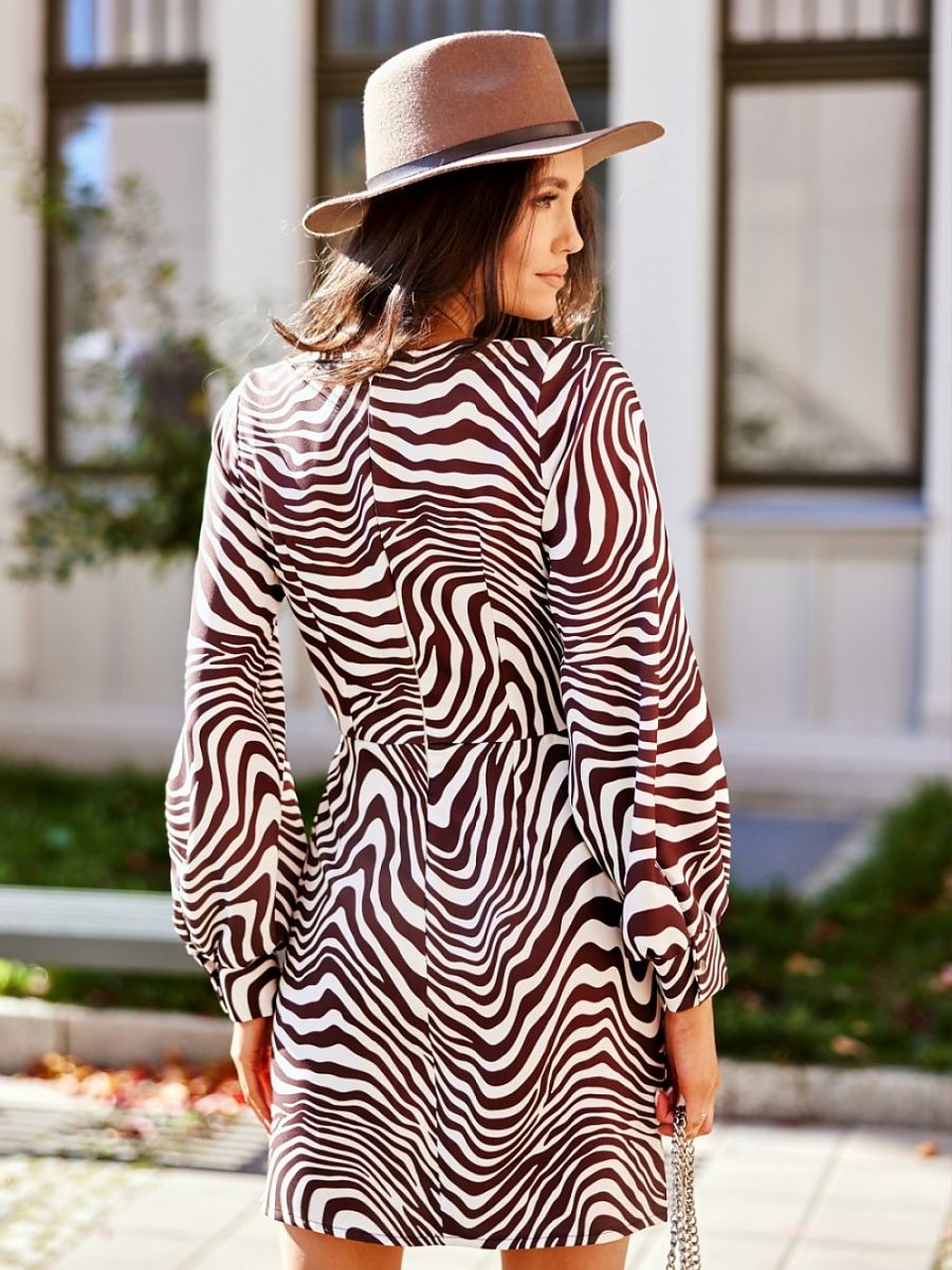 Deep neckline, long buffet sleeves finished with a button cuff. The mini length will highlight the legs in a wonderful way, and the gently flared hem will allow you to conceal minor imperfections and optically slenderize the entire figure. Fastened at the back with a zipper. The mini dress with an envelope neckline was created for women who like to look striking and attract their attention without too much effort. All you need to do is to choose the right shoes, and in this case the best choice will be high-heeled shoes, which will give the whole thing character. This model of dress will allow you to create an elegant, timeless styling, which is perfect for various celebrations, such as weddings, communions, birthdays, parties with friends, special banquets. The product is manufactured and sewn in Poland.