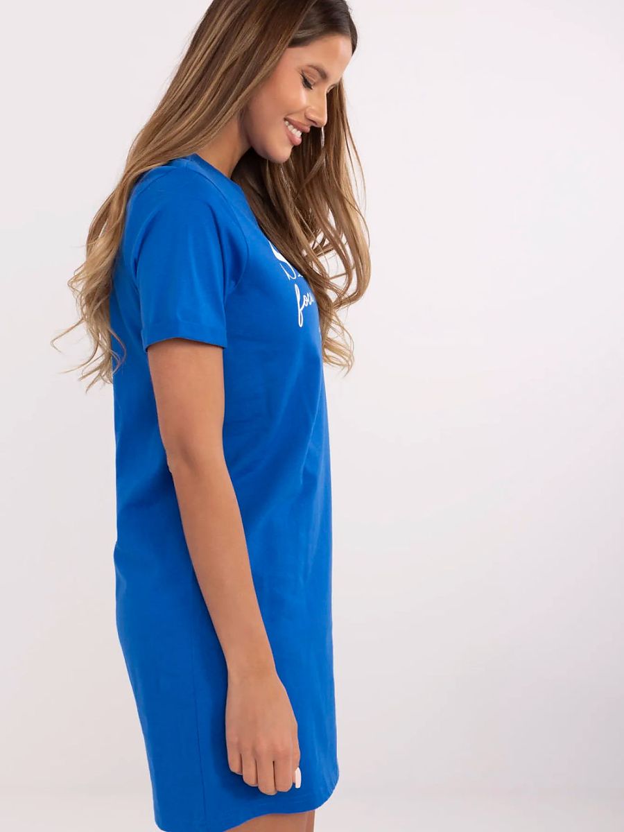 The everyday dress with a simple cut is the perfect combination of comfort and style. Made of soft, breathable cotton, it provides comfort throughout the day. The classic short sleeve and round neckline give it a versatile character, and the knee-length makes it a great choice for everyday wear. The front of the dress is decorated with a trendy print, which adds originality and emphasizes the casual style. It pairs well with sneakers, sandals, or sneakers, creating a light and casual outfit for any occasion.