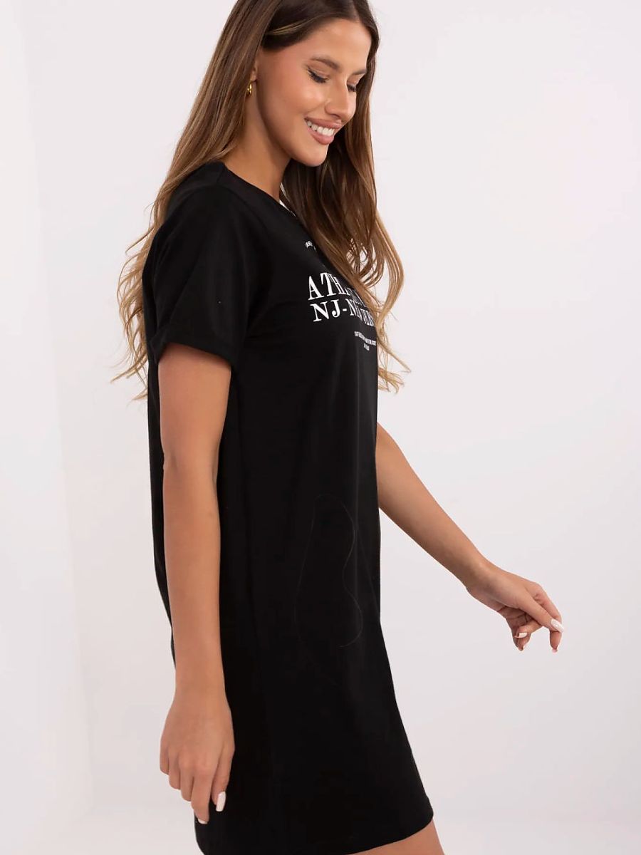 The daily dress with a simple cut is the perfect combination of comfort and style. Made of soft, breathable cotton, it provides comfort throughout the day. The classic short sleeve and round neckline give it a universal character, and the knee-length makes it a perfect choice for everyday wear. The front of the dress is adorned with a fashionable print, which adds originality and emphasizes the casual style. It will work great in combination with sneakers, sandals or sneakers, creating a light and casual styling for any occasion.