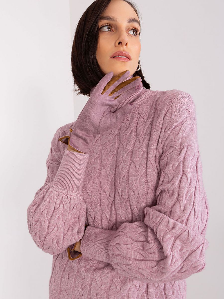 Elegant women’s gloves made of smooth material with contrasting inserts between the fingers. At the wrists decorative contrasting braided straps. Thumb and index finger with an embroidered flower, allowing you to operate the phone, without having to take off the gloves.