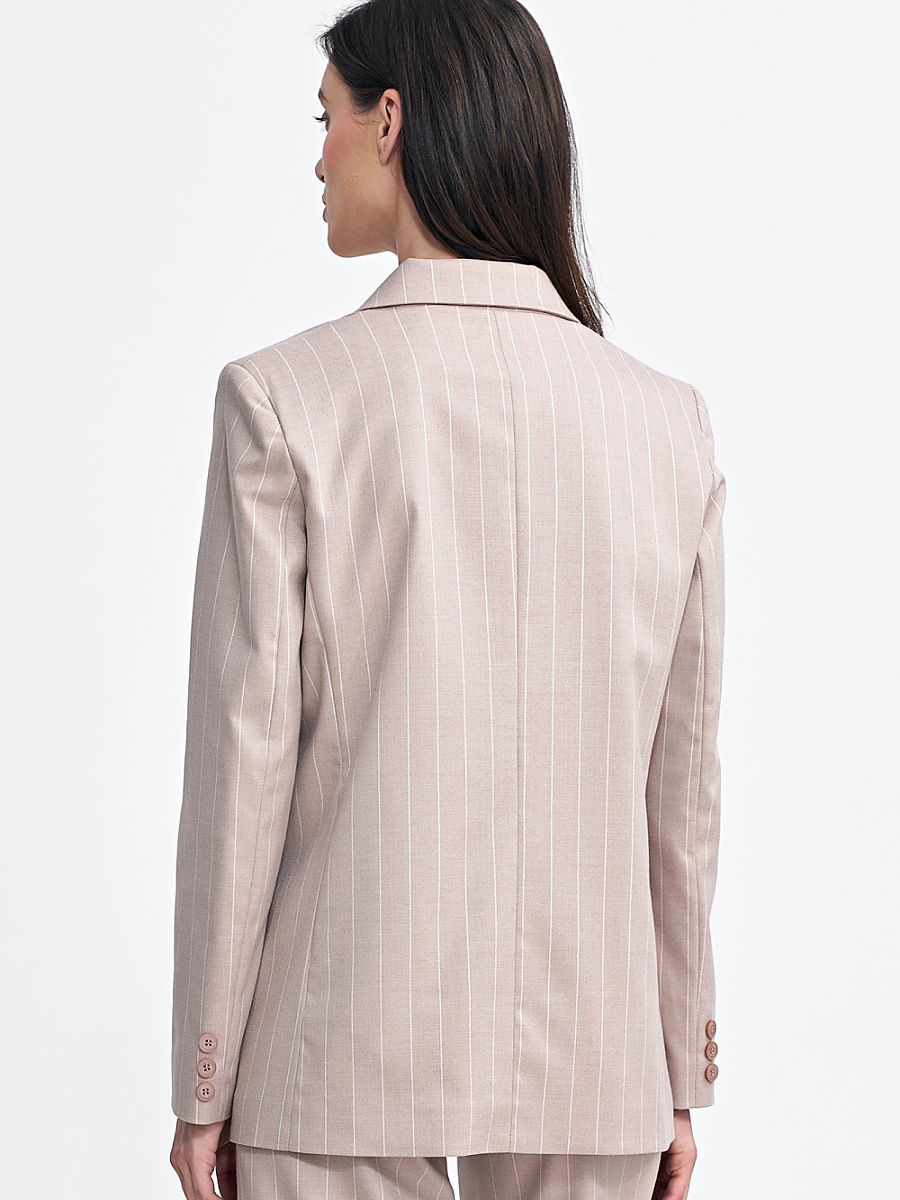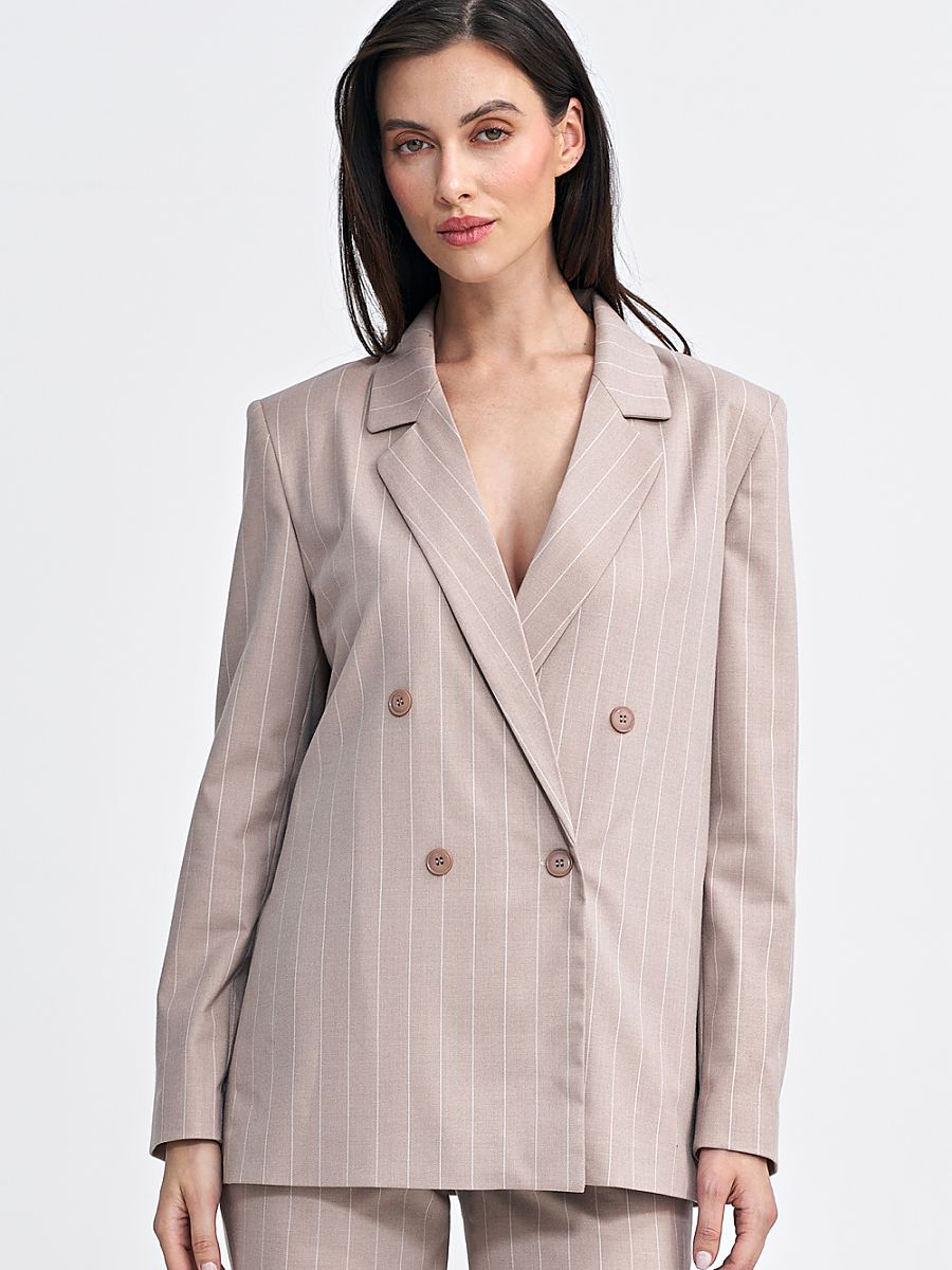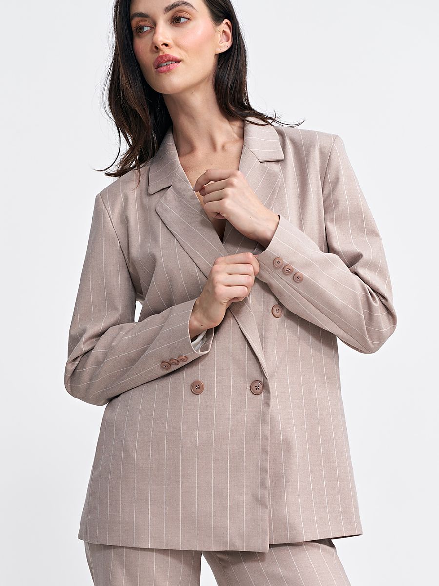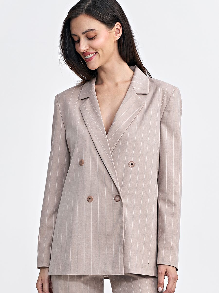 Oversized jacket made of material with subtle, contrasting tennis-style stripes. It has a collar with lapels and long sleeves with buttons at the bottom. Shoulder pads add definition and elegance to the silhouette. The jacket is hip-length, emphasizing its modern character. Double-breasted button closure at the front gives it a classic and timeless look. Finished with a lining for comfort and aesthetics.