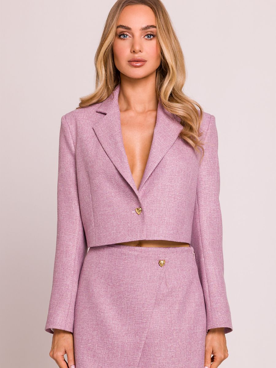 Elegant short blazer with a timeless cut, made of high-quality fabric. The classic collar gives it elegance, and the decorative heart-shaped button adds a subtle, unique accent. The model is fully lined, which ensures comfort and perfect fit on the silhouette. It perfectly complements both elegant and casual stylizations. Designed and sewn in Poland with attention to every detail.