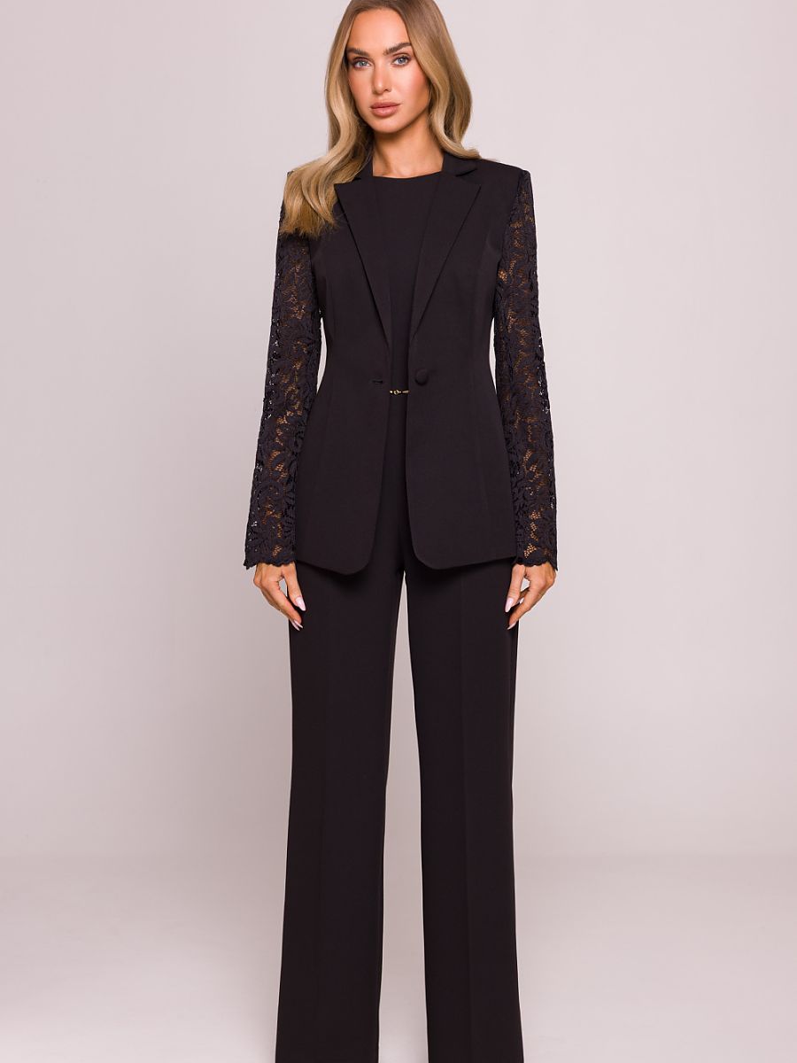 Stylish blazer that combines timeless form with modern detail. Made of smooth, high-quality fabric, it has been enriched with long sleeves made of elastic lace, which add lightness and feminine character to the whole. The classic collar with lapels and a single-button front closure give it an elegant, balanced look. The lack of pockets emphasizes the purity of the form, and the slightly tailored fit with a straight hem beautifully complements the silhouette, emphasizing its assets. The hip-length makes the blazer perfect for both formal stylings and more modern combinations such as with jeans or a skirt. Designed and made in Poland, with attention to detail and quality of workmanship. Lace 90% nylon, 10% spandex.