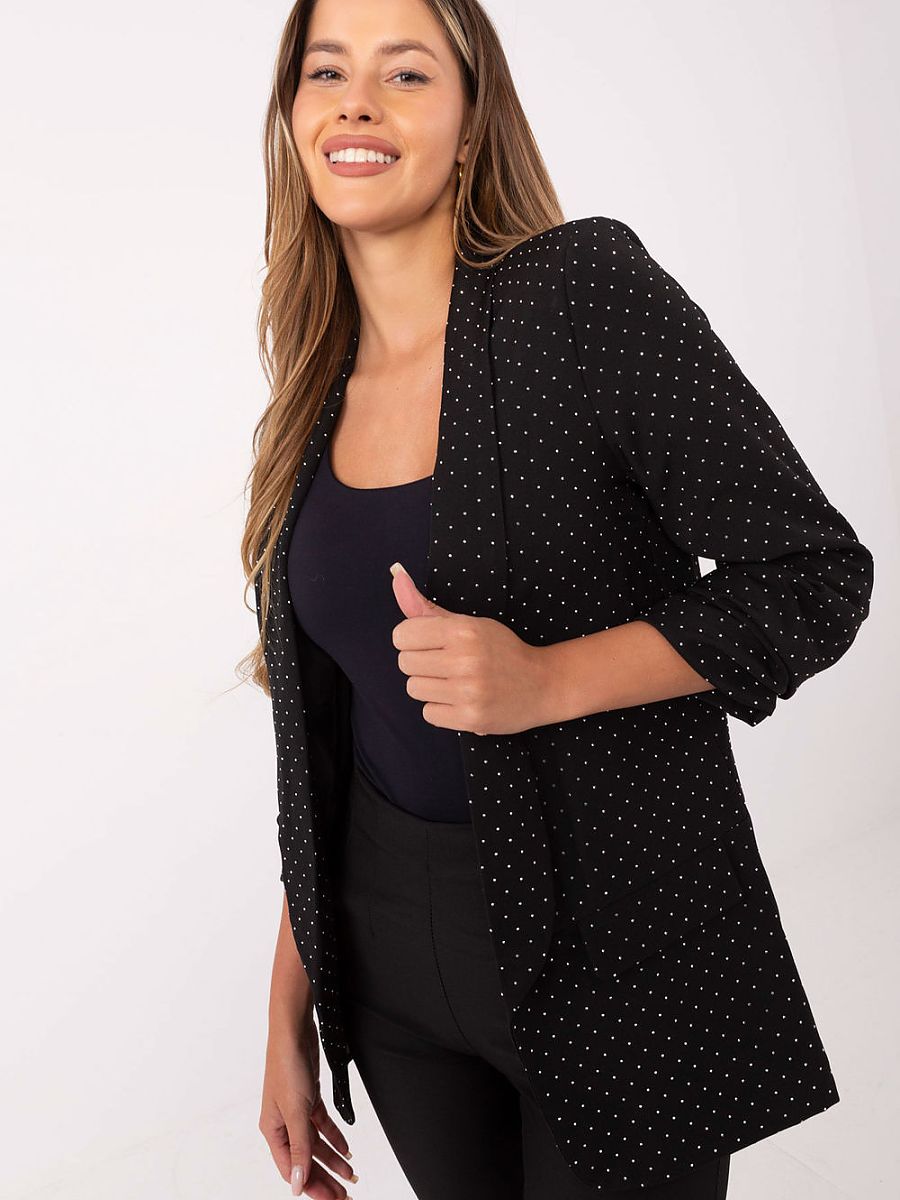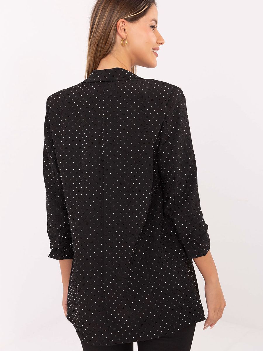 Elegant women’s blazer of standard length, made of a dominant blend of viscose and polyester, with a lining ensuring comfort when worn. The buttonless model presents a modern and light character, and the sewn-in shoulder pads subtly emphasize the silhouette, giving it distinctive proportions. The entire surface of the material is adorned with decorative sequins, which introduce a touch of shine and make the blazer an ideal choice for formal occasions or events. The 3/4 length sleeves are decorated with delicate pleats, adding feminine elegance and original style to the overall look.