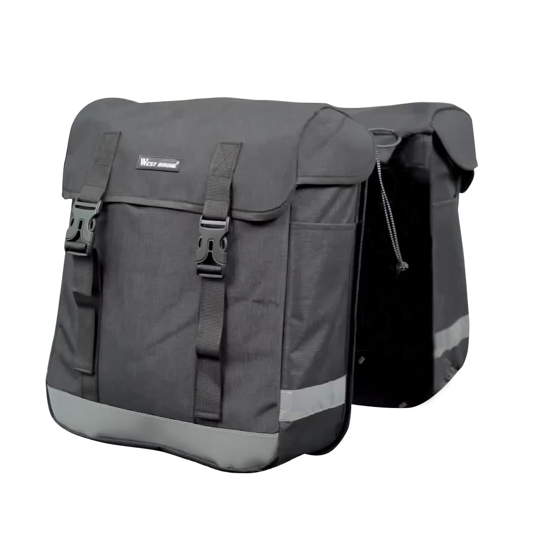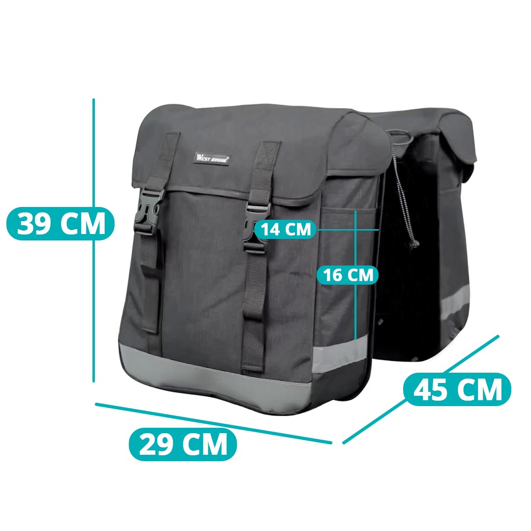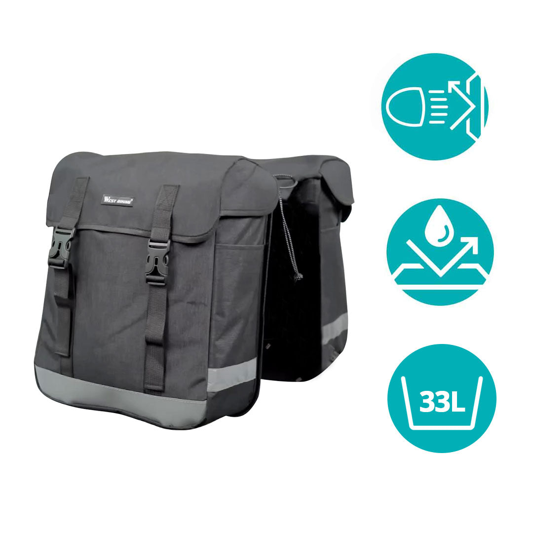 Kétoldalas kerékpártáska 33 literes űrtartalommal, elkülönített zsebekkel.