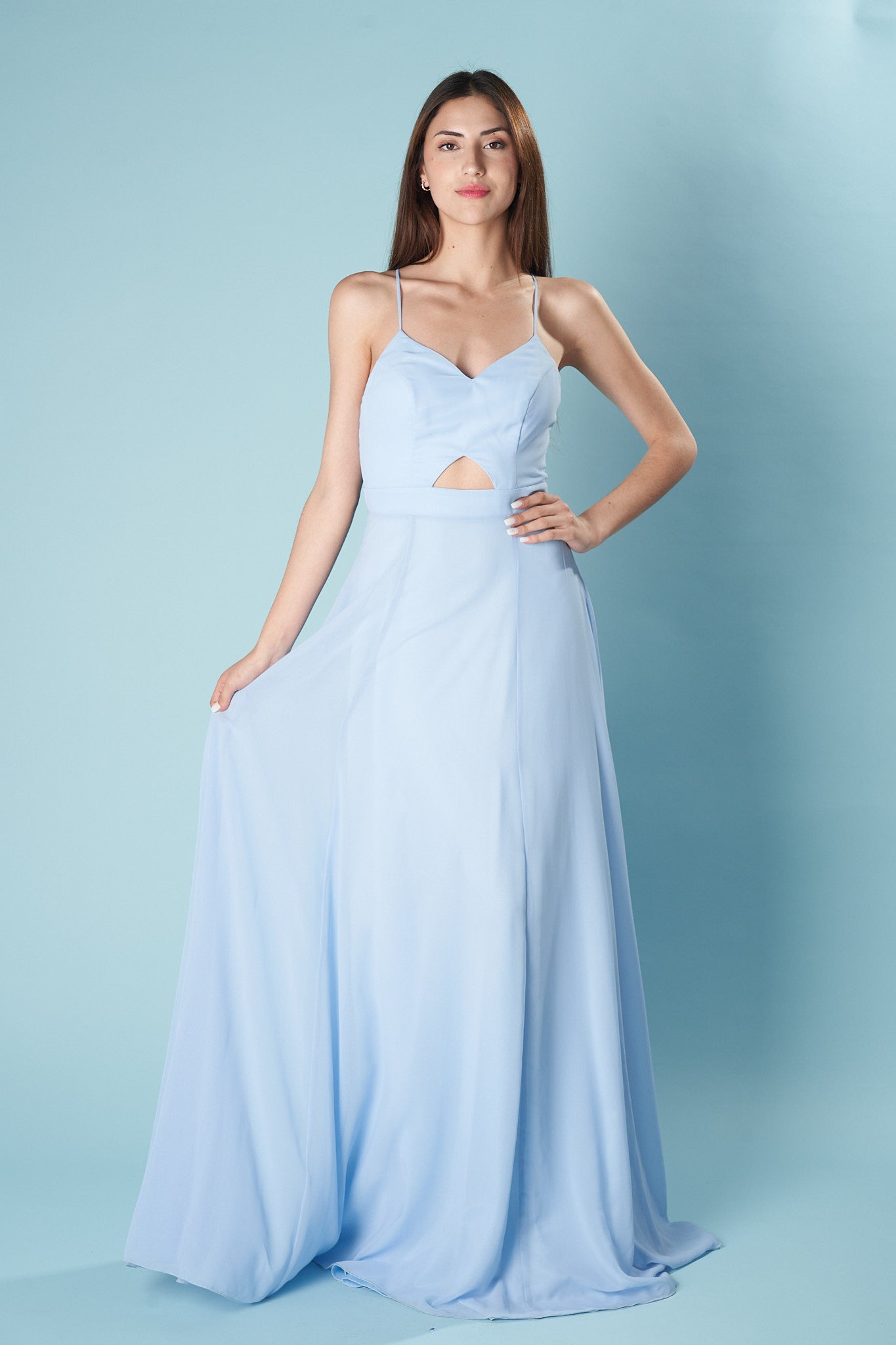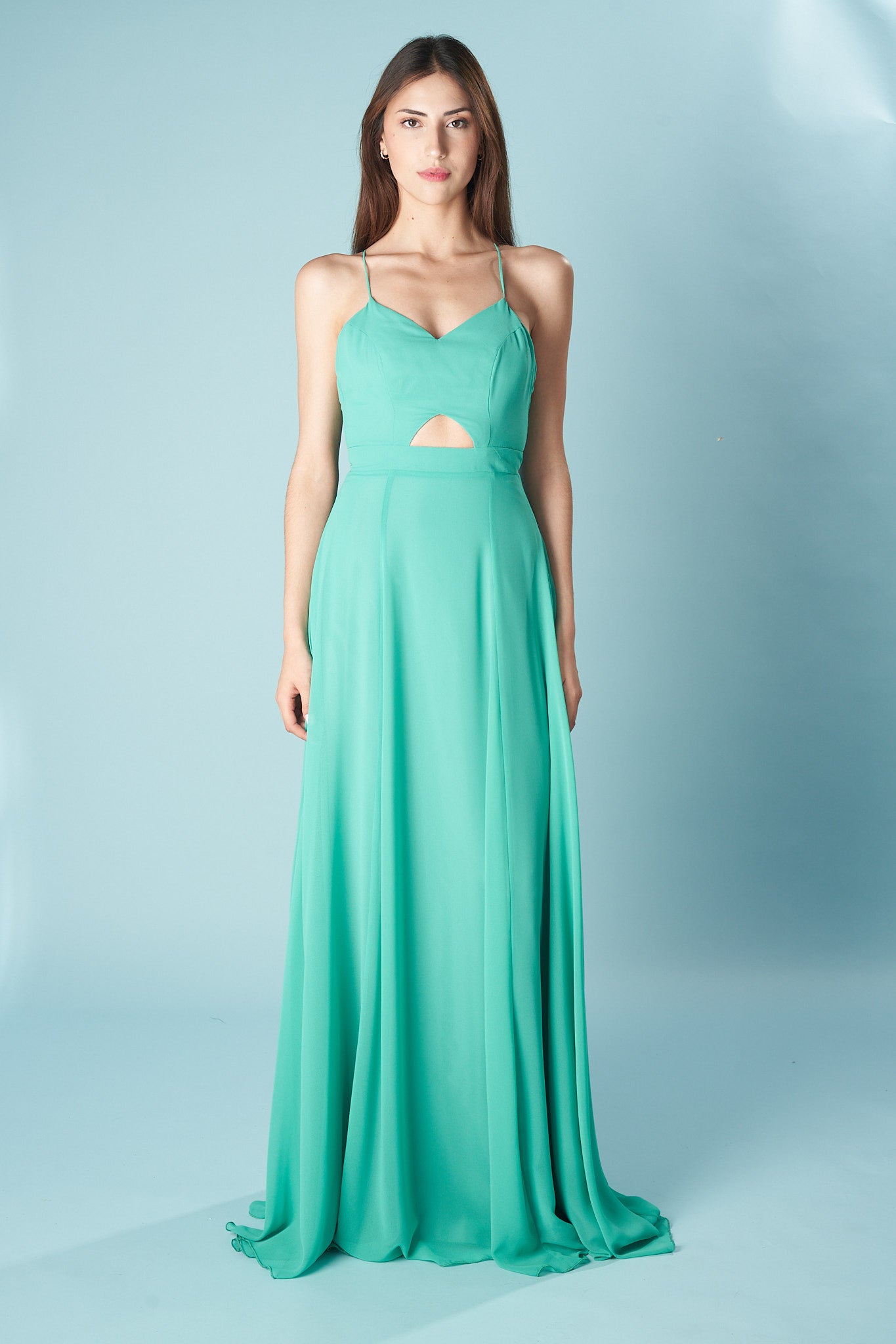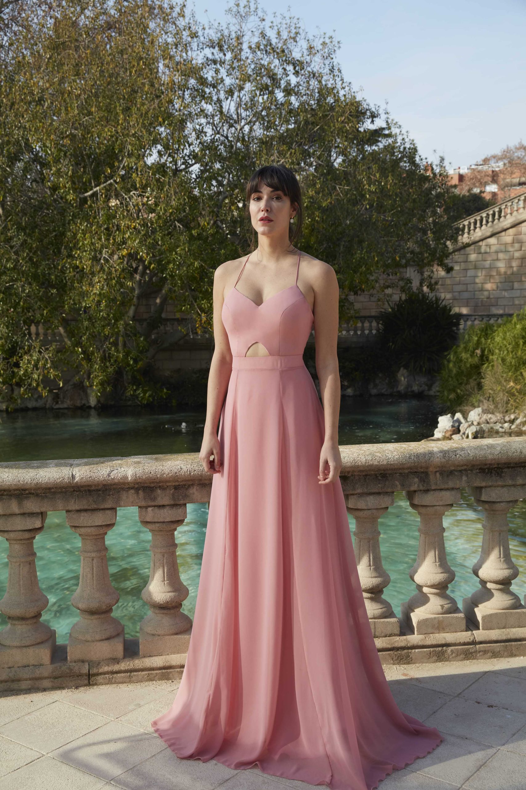 Vestido largo con top escote corazòn ajustado y falda amplia, confeccionado en tejido gasa que acompaña el movimiento. La cintura se define sutilmente para estilizar la figura, y su espalda abierta mantiene la limpieza visual de la prenda. Perfecto para invitadas a eventos de día o celebraciones más sobrias.