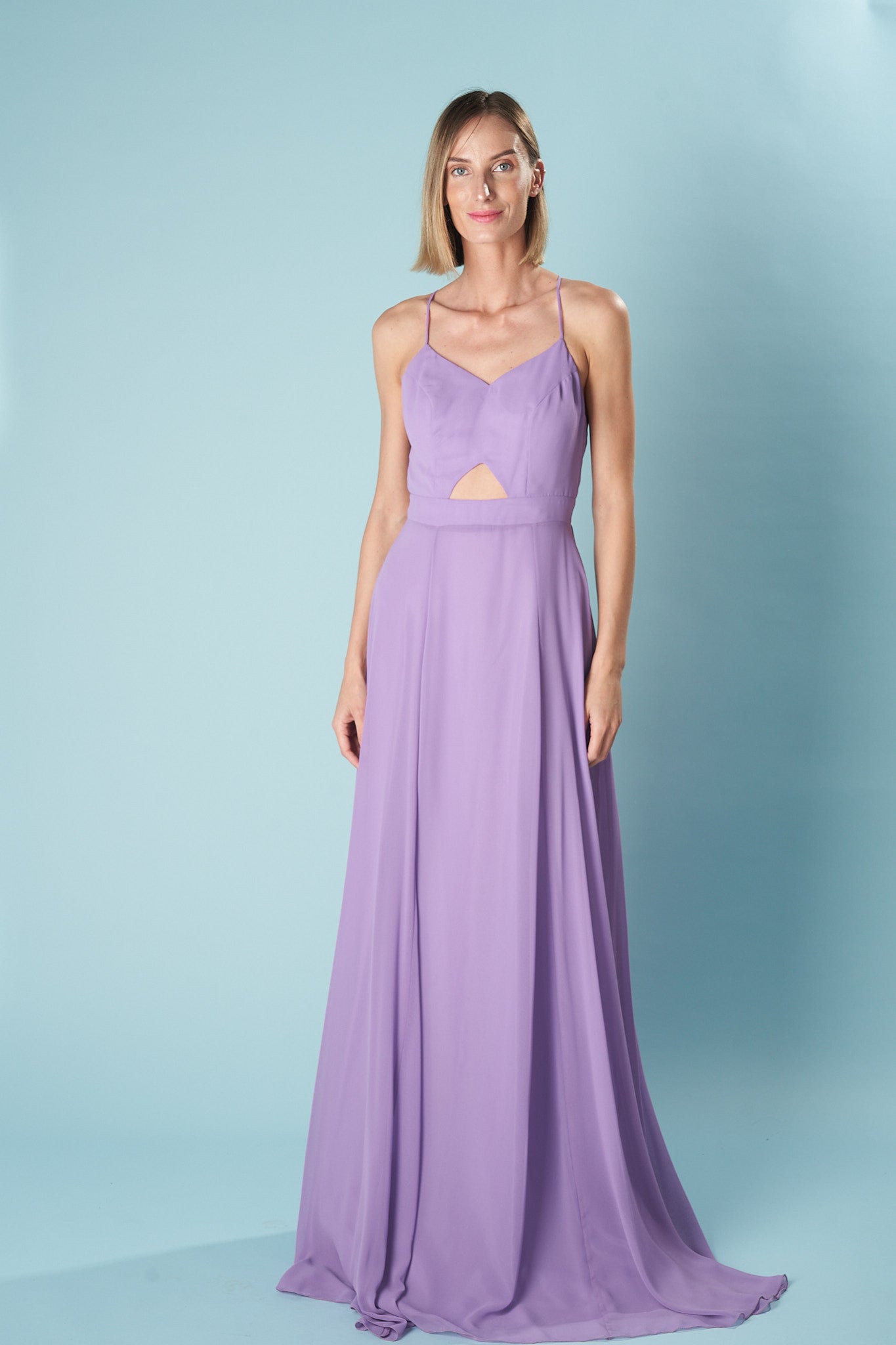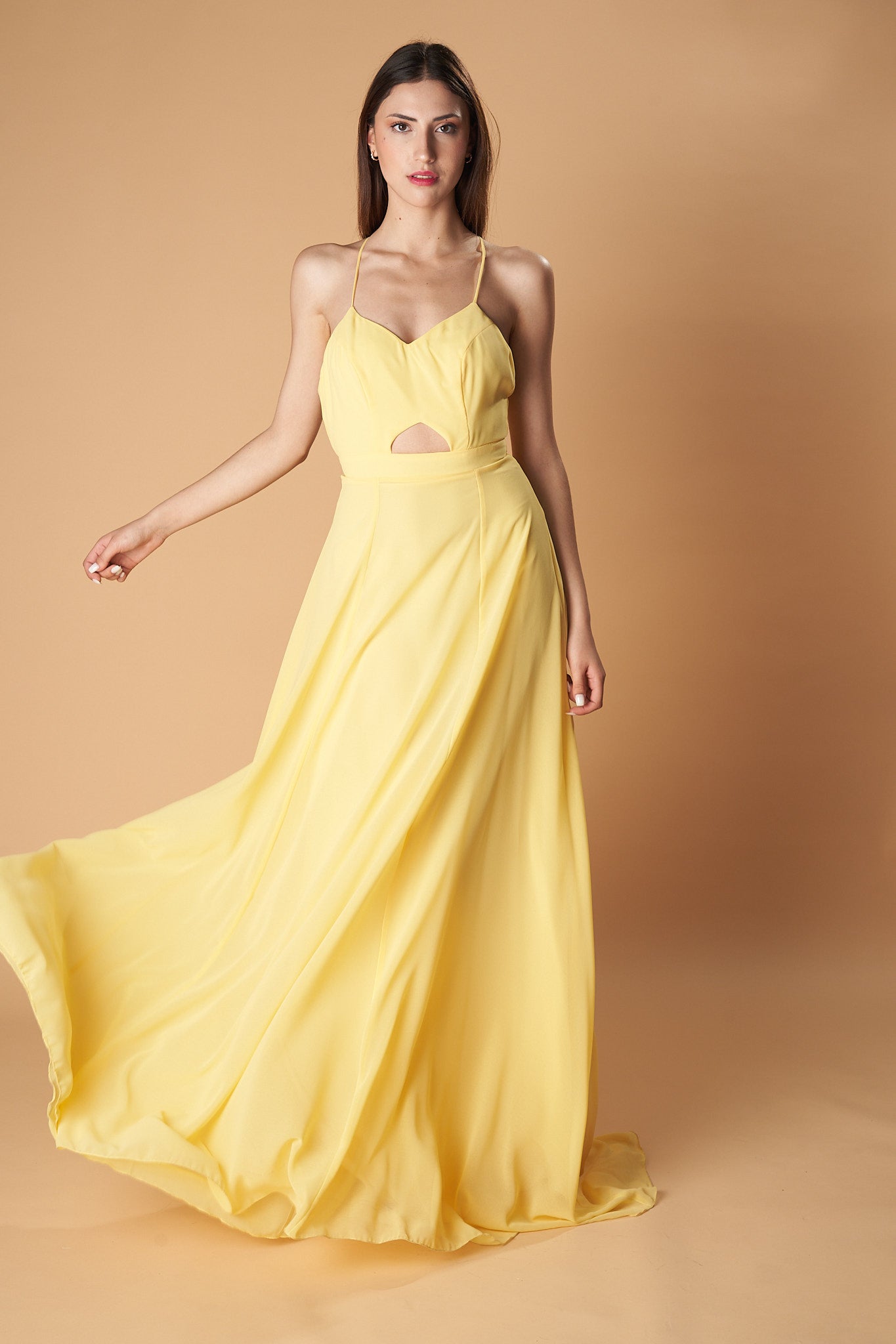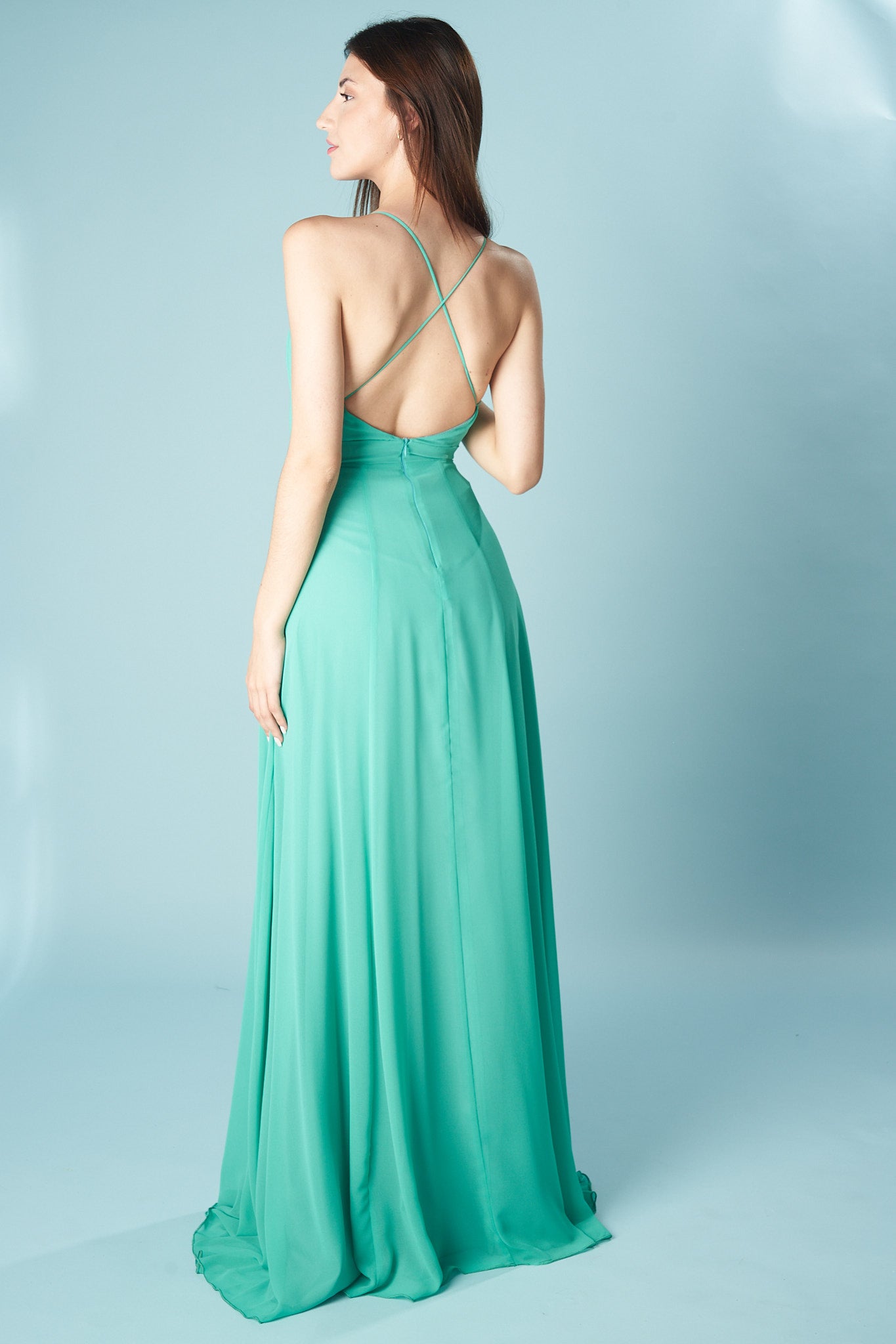 Vestido largo con top escote corazòn ajustado y falda amplia, confeccionado en tejido gasa que acompaña el movimiento. La cintura se define sutilmente para estilizar la figura, y su espalda abierta mantiene la limpieza visual de la prenda. Perfecto para invitadas a eventos de día o celebraciones más sobrias.
