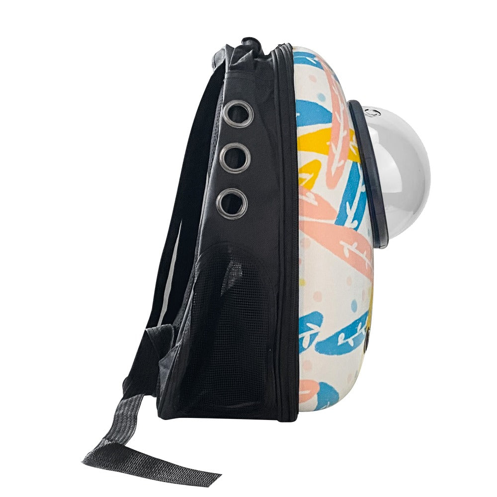 Nowoczesny plecak do noszenia kotów i małych psów z otworami wentylacyjnymi, przezroczystym okienkiem z pleksi i wyściełanymi paskami na ramiona dla wygodnej podróży.