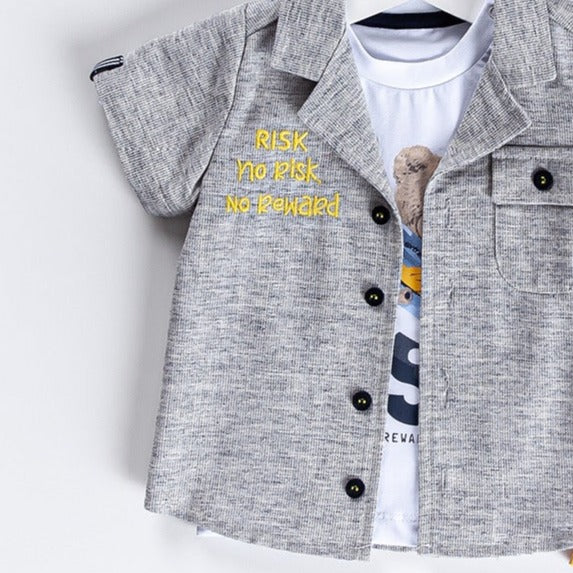Bel ensemble de garçon votre courageux enfant comprenant une chemise assez confortable qui l’accompagnera dans toutes ses aventures (70% Cotton 30% polyester), un t-shirt en coton (95% Cotton 5% lycra), et d’un short en coton (98% Cotton 2% élastique).