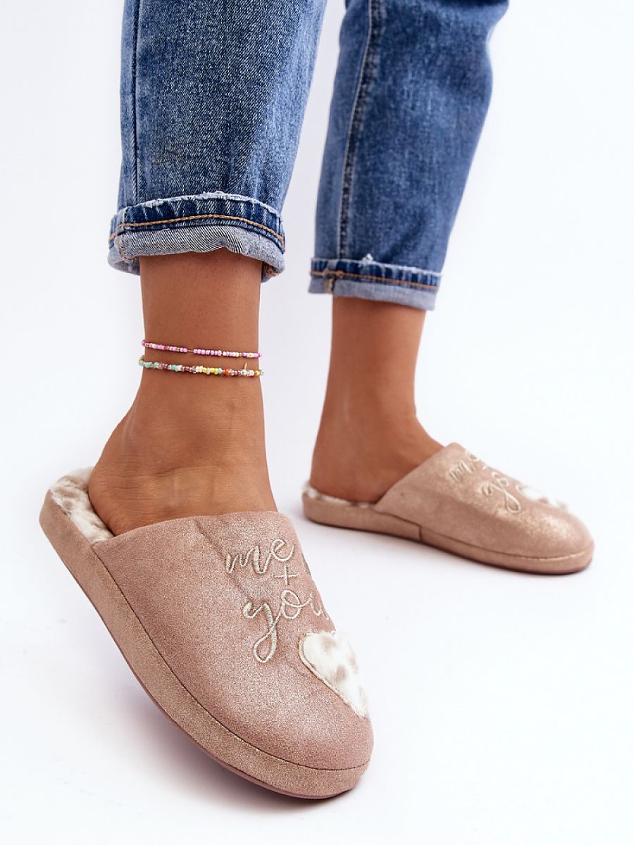 Shiny women’s slippers decorated with an inscription and a heart. Slip-on model with covered nose. Set on a thick sole. Insole insulated with fur.