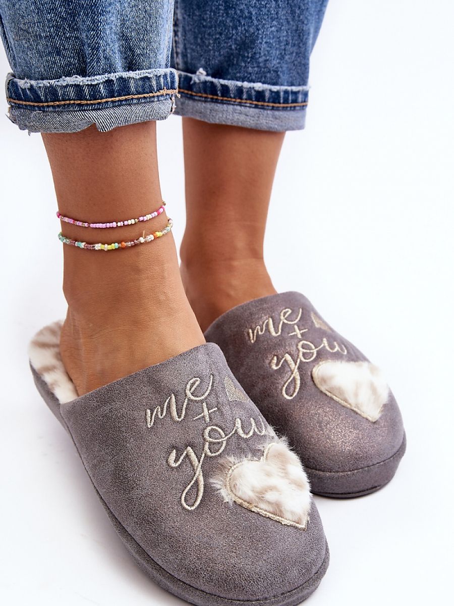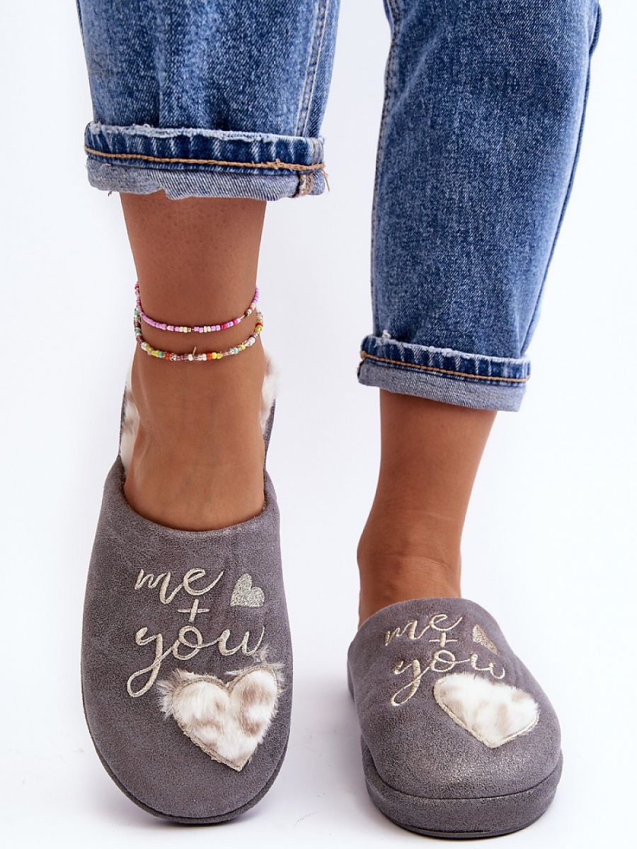 Shiny women’s slippers decorated with an inscription and a heart. Slip-on model with covered nose. Set on a thick sole. Insole insulated with fur.