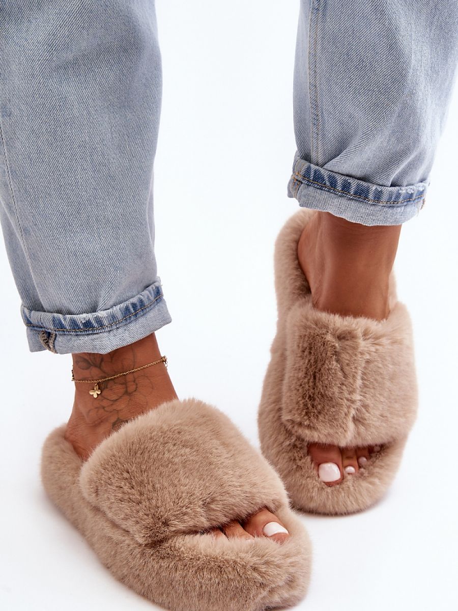 Women’s slippers were made of ecological fur. Slip-on model with an open nose and a wide strap. The sole made of rubber material will protect against cold ground.