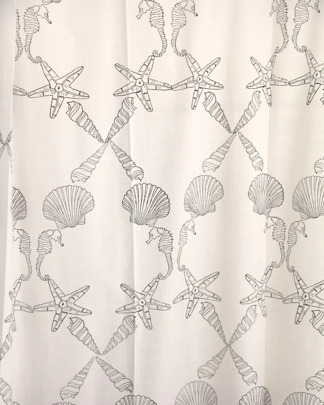 • Hand Block Printed Design: Each curtain panel showcases a unique, hand block printed pattern featuring stylized seashells and seahorses in contrasting black on a crisp white background. This artisanal technique creates subtle variations in the design, adding character and charm to your windows.